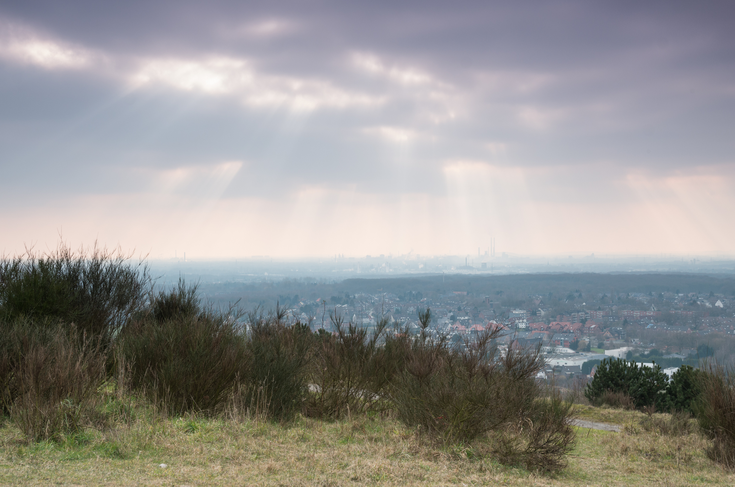 Netterweise bietet sich von der Halde schon aus ihrer Entstehung heraus - letztlich handelt es sich ja um nicht mehr und nicht weniger als einen aufgeschütteten Hügel - ein hübscher Blick auf das Ruhrgebiet, dass in sich ja eher das Relief eines Bügelbretts besitzt. Wie auch schon beim Tiger and Turtle, lenkt der Blick doch ganz gut ab von den post-florierten Stadtkernen der angrenzenden Orte. Bottrop, meine Perle bist und wirst du wohl nicht mehr.