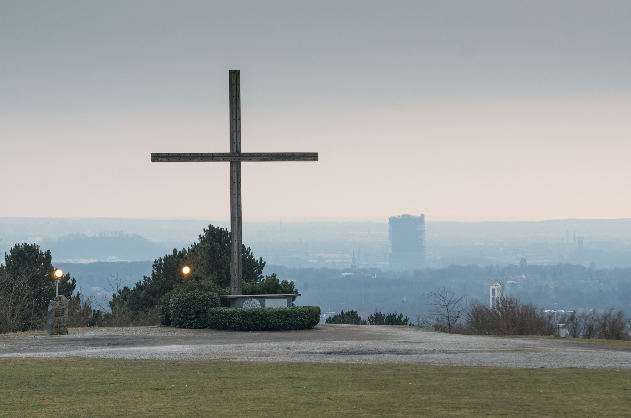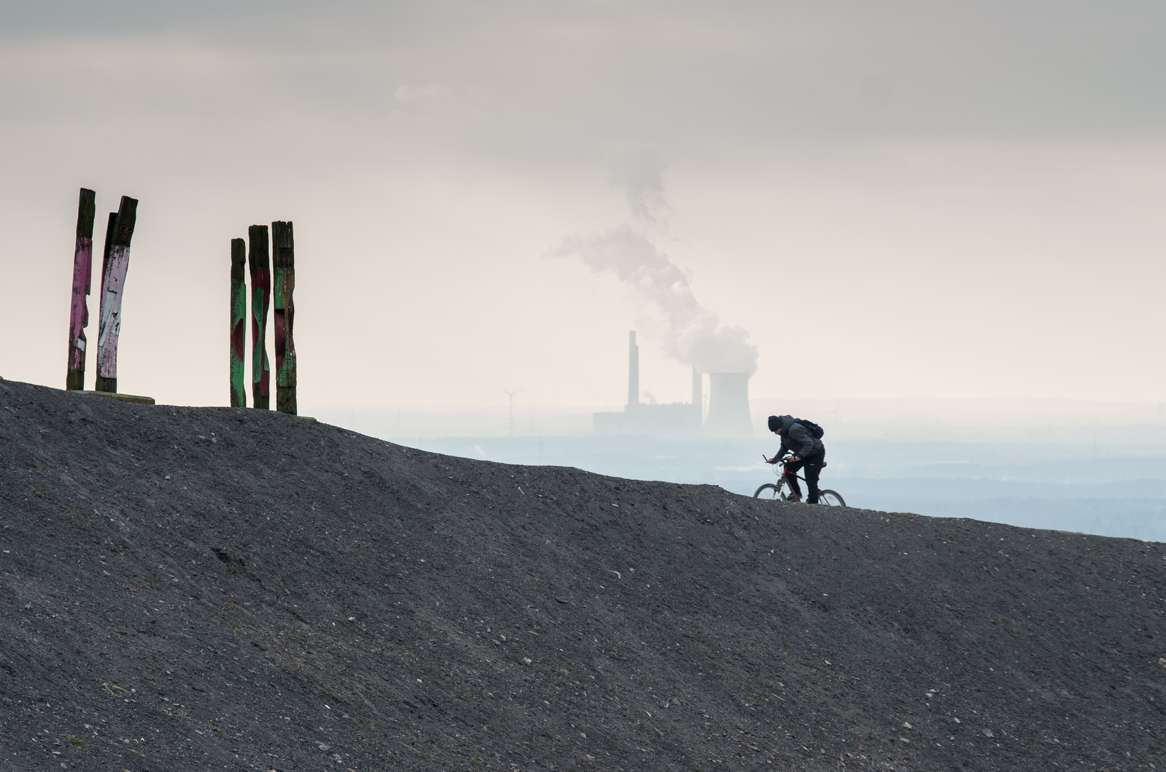 Zurück zu den Totems und ihrer Symbolkraft. Dass dieses Denkmal der Industriekultur ausgerechnet hier steht, entbehrt nicht gerade einer gewissen Ironie. Denn zu den Haldenfüßen liegt das letzte aktive Steinkohlebergwerk Deutschlands, die Zeche Prosper Daniel. Noch. Denn 2018 wird auch hier der letzte Bergmann den Schacht schließen. Der Blick vom Gipfel hinunter auf das Gipfelkreuz offenbart da schon eine gewisse Vorahnung.