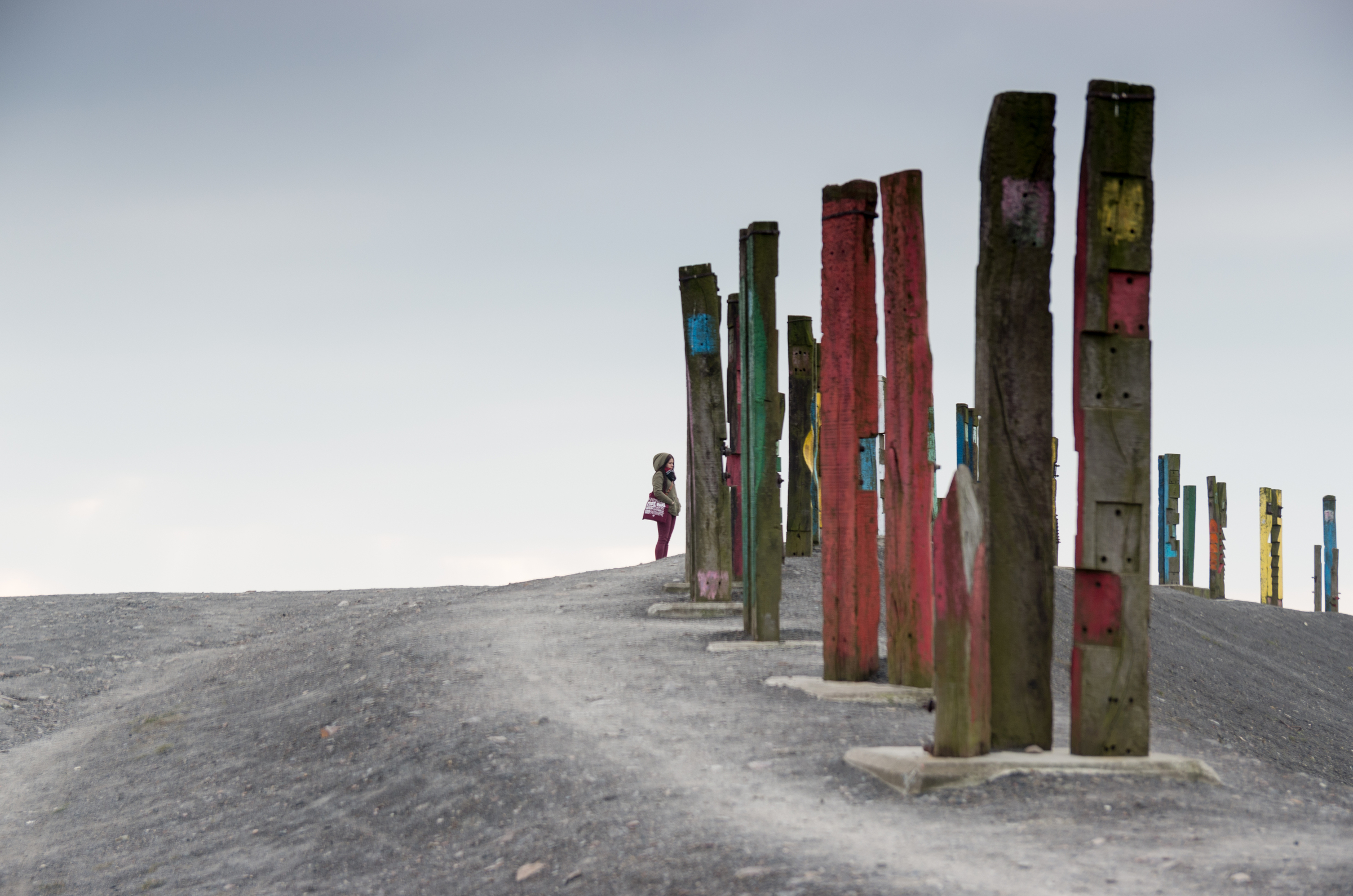Neben dem Tiger and Turtle von Duisburg gehört diese Halde für mich zu den absolut sehenswerten. Das liegt vor allem am Äußeren: dem Kontrast zwischen buntem Holz und schwarz-grauem Abraum. 105 dieser Holzpfähle stehen auf dem "Gipfel". Allesamt teilt sie ihre Herkunft als ehemalige Bahnschwellen. Doch der baskische Künstler Agustín Ibarrola hat sie alle unterschiedlich bearbeitet, 2002 hier schließlich in den Boden gerammt. Damit wollte er die scheinbaren Gegensätze von Industrie und Natur zusammenführen. Das Ergebnis schreit geradezu nach Aufmerksamkeit.